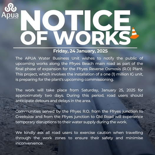 The Antigua Public Utilities Authority (APUA) Water Business Unit wishes to notify the public of upcoming works along the Ffryes Beach main road as part of the final phase of expansion for the Fryes Reverse Osmosis (R.O) Plant.