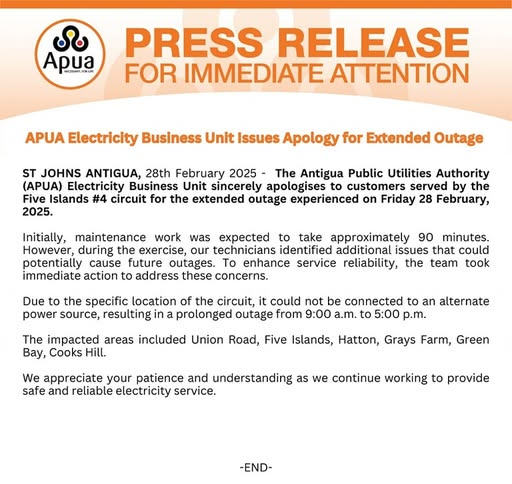 ST JOHNS ANTIGUA, 28th February 2025: The Antigua Public Utilities Authority (APUA) Electricity Business Unit sincerely apologises to customers served by the Five Islands #4 circuit for the extended outage experienced on Friday 28 February, 2025.