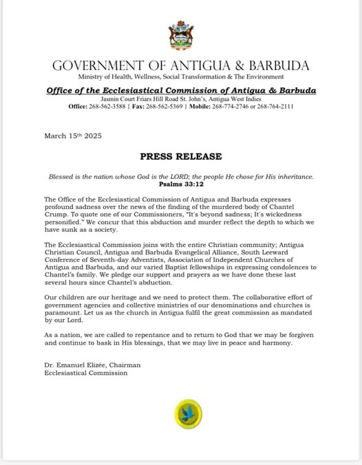 The Office of the Ecclesiastical Commission of Antigua and Barbuda expresses profound sadness over the news of the finding of the murdered body of Chantel Crump.