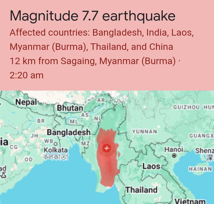 United States Geological Survey (USGS): Notable quake, preliminary info: M 7.7 – 16 km NNW of Sagaing, Myanmar: , DYFI? – VIII,