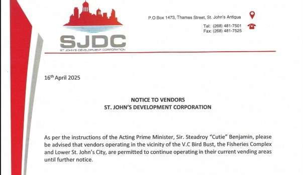 As per the instructions of the Acting Prime Minister, Sir. Steadroy “Cutie” Benjamin, please be advised that vendors operating in the vicinity of the V.C Bird Bust, the Fisheries Complex and Lower St. John’s City, are permitted to continue operating in their current vending areas until further notice.