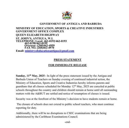 Sunday, 11th May, 2025 – In light of the press statement issued by the Antigua and Barbuda Union of Teachers on Sunday evening of continued industrial action, the Ministry of Education, Sports and Creative Industries hereby informs parents and guardians that all classes scheduled for Monday, 12th May, 2025, are cancelled at public schools throughout the country, and children should remain at home until all outstanding matters with the A&BUT are settled and notice of resumption of classes is issued.