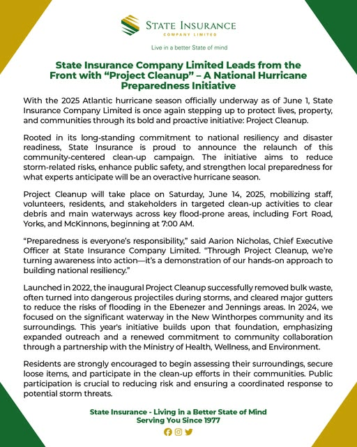 STATE INSURANCE COMPANY LIMITED, June 6, 2025: With the 2025 Atlantic hurricane season officially underway as of June 1, State Insurance Company Limited is once again stepping up to protect lives, property, and communities through its bold and proactive initiative: Project Cleanup.