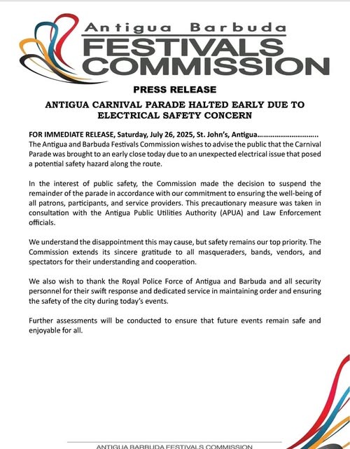 FESTIVALS COMMISSION – Saturday, July 26, 2025, St. John’s, Antigua: The Antigua and Barbuda Festivals Commission wishes to advise the public that the Carnival Parade was brought to an early close today due to an unexpected electrical issue that posed a potential safety hazard along the route.