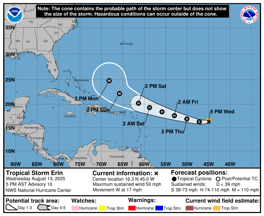 Notwithstanding, it is still too early to know exactly what impacts Erin might bring to the islands. However, the risk from swells will rise; hence, those near coastal areas should be aware. Other hazards could come into play in the next 24 hours.
