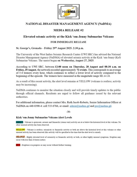 The University of the West Indies Seismic Research Centre (UWI SRC) has advised the National Disaster Management Agency (NaDMA) of elevated seismic activity at the Kick ’em-Jenny (KeJ) Submarine Volcano. The unrest began on Wednesday, August 27, 2025.