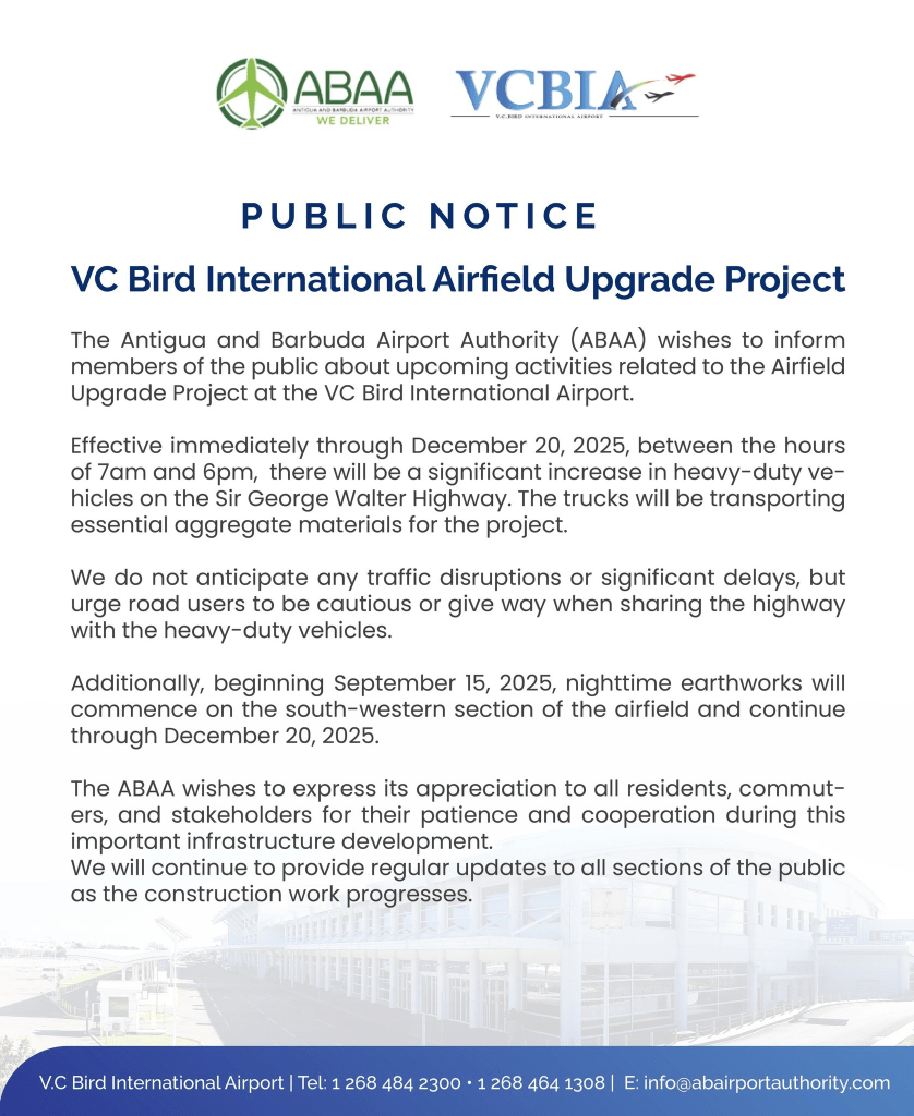 The Antigua and Barbuda Airport Authority (ABAA) wishes to inform members of the public about upcoming activities related to the Airfield Upgrade Project at the VC Bird International Airport.