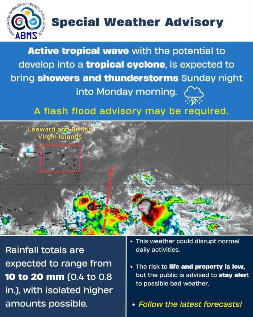 Antigua and Barbuda Meteorological Service: An active tropical wave, with the potential to develop into a tropical cyclone, is expected to bring showers and thunderstorms Sunday night (October 19, 2025) into Monday morning.
