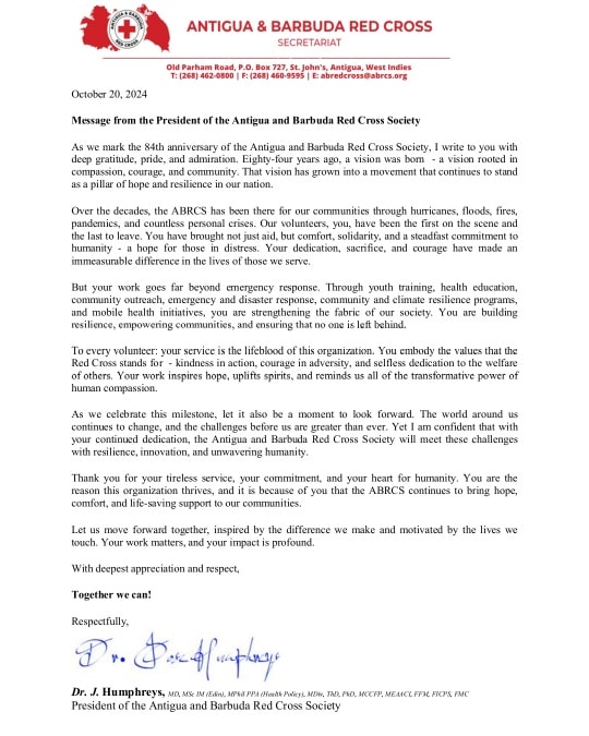 Dr. J. Humphreys: As we mark the 84th anniversary of the Antigua and Barbuda Red Cross Society, I write to you with deep gratitude, pride, and admiration.