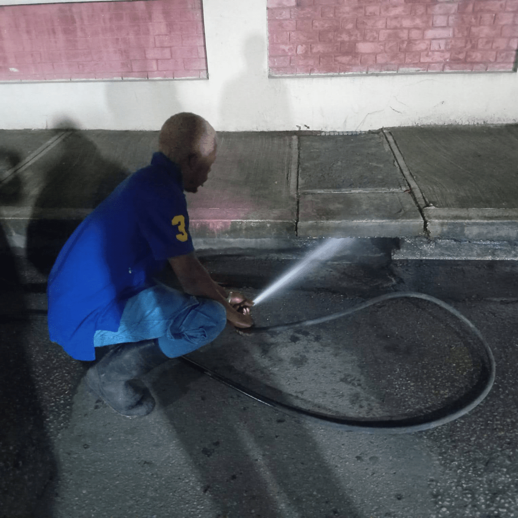 At approximately 4:00 a.m., the NSWMA team was joined by officers from the Central Board of Health, who conducted sanitation activities including gutter spraying, the application of white lime, and the placement of bait to support rodent control efforts.