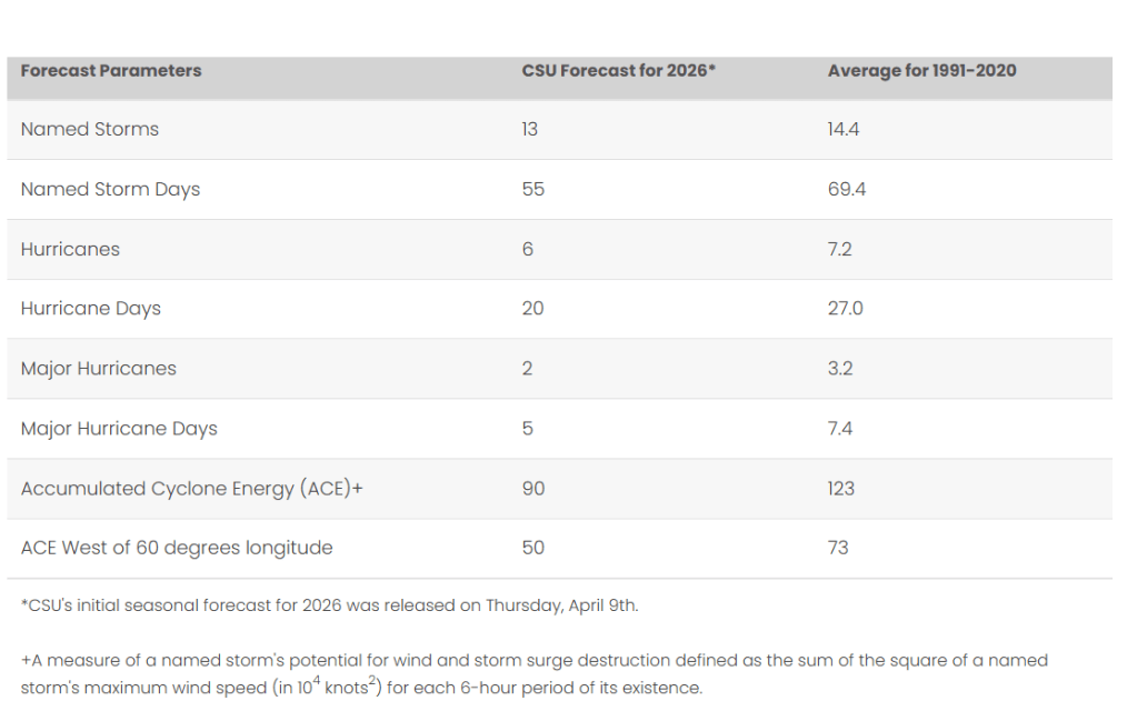 Colorado State University (CSU): We anticipate that the 2026 Atlantic basin hurricane season will have somewhat below-normal activity. Current weak La Niña conditions are likely to transition to El Niño in the next few months, with the potential for a moderate/strong El Niño for the peak of hurricane season.