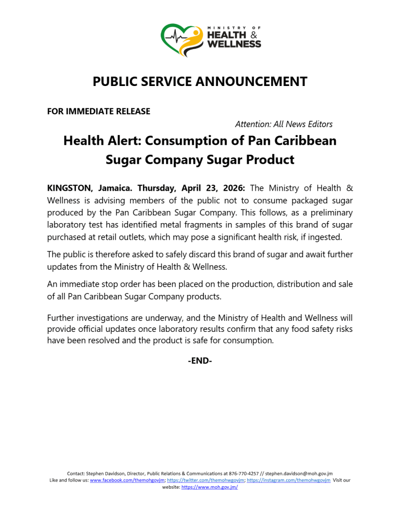Ministry of Health & Wellness: The Ministry of Health & Wellness is advising members of the public not to consume packaged sugar produced by the Pan Caribbean Sugar Company.